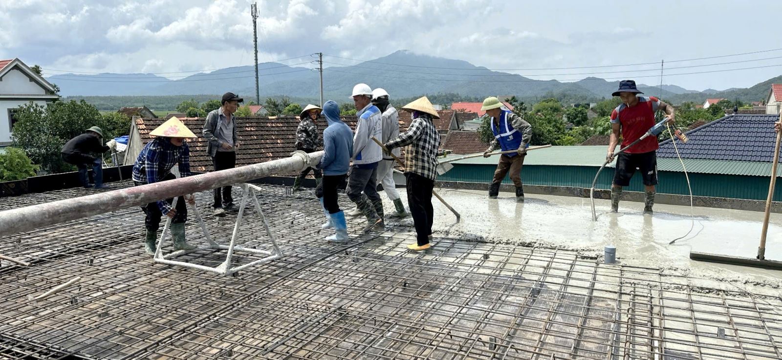 Nhờ sự chuẩn bị kỹ lưỡng và tinh thần làm việc quyết liệt, ngày hôm qua gần 300m² sàn mái biệt thự vườn của anh Dũng đã được hoàn thành, đánh dấu một cột mốc quan trọng trong hành trình xây dựng công trình.