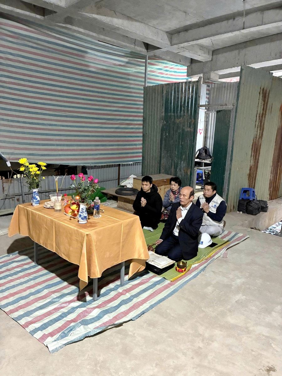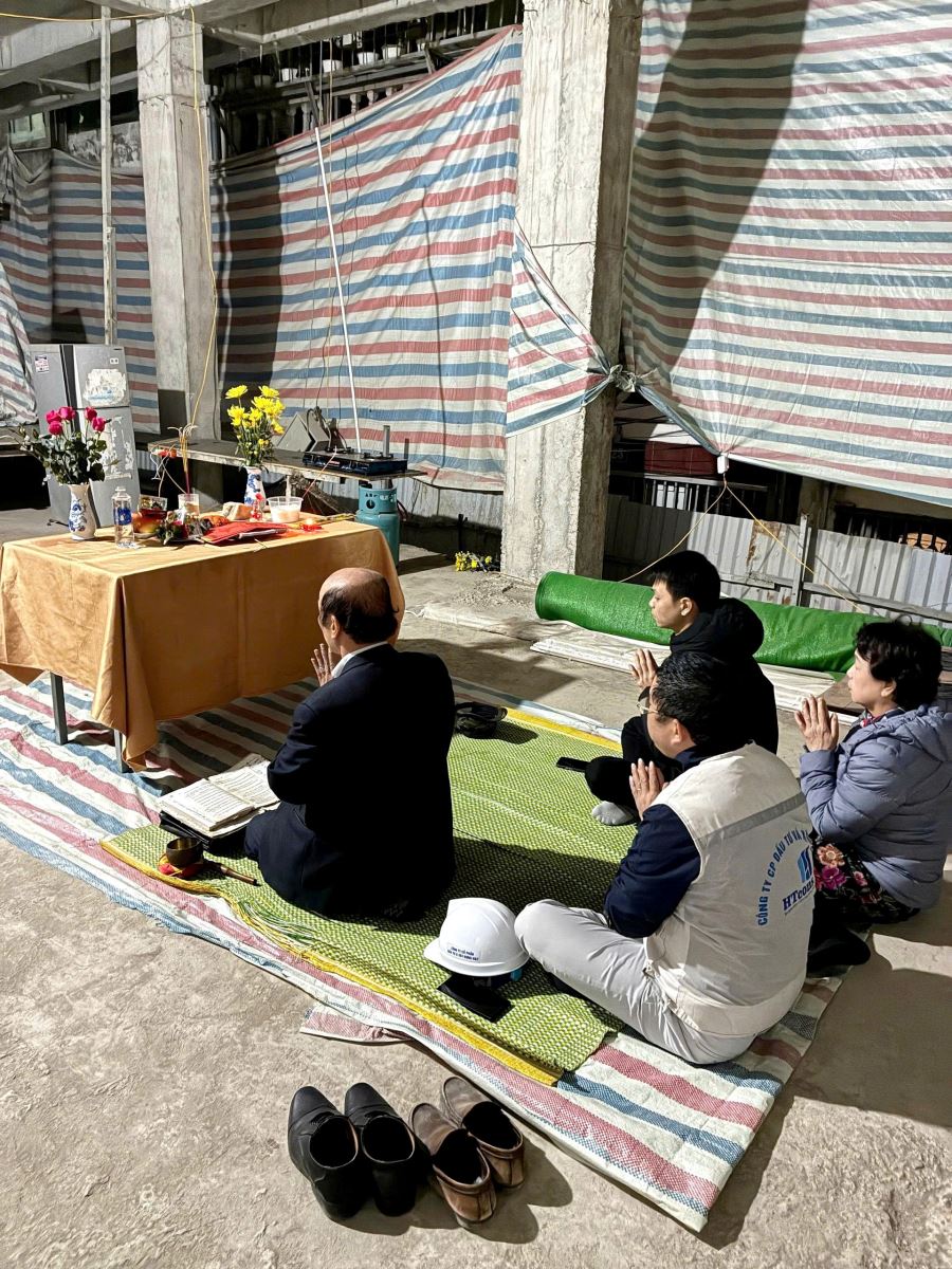 Một buổi lễ cất nóc được tổ chức chỉn chu, thành tâm từ 6h sáng – đánh dấu cột mốc quan trọng trong hành trình kiến tạo công trình.