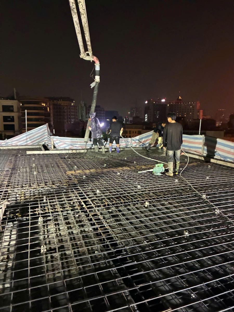 Tiếp nối là một đêm thi công liên tục, hạng mục đổ bê tông cất nóc hoàn thành vào 1h sáng hôm sau, đảm bảo đúng quy trình kỹ thuật, an toàn và chất lượng.