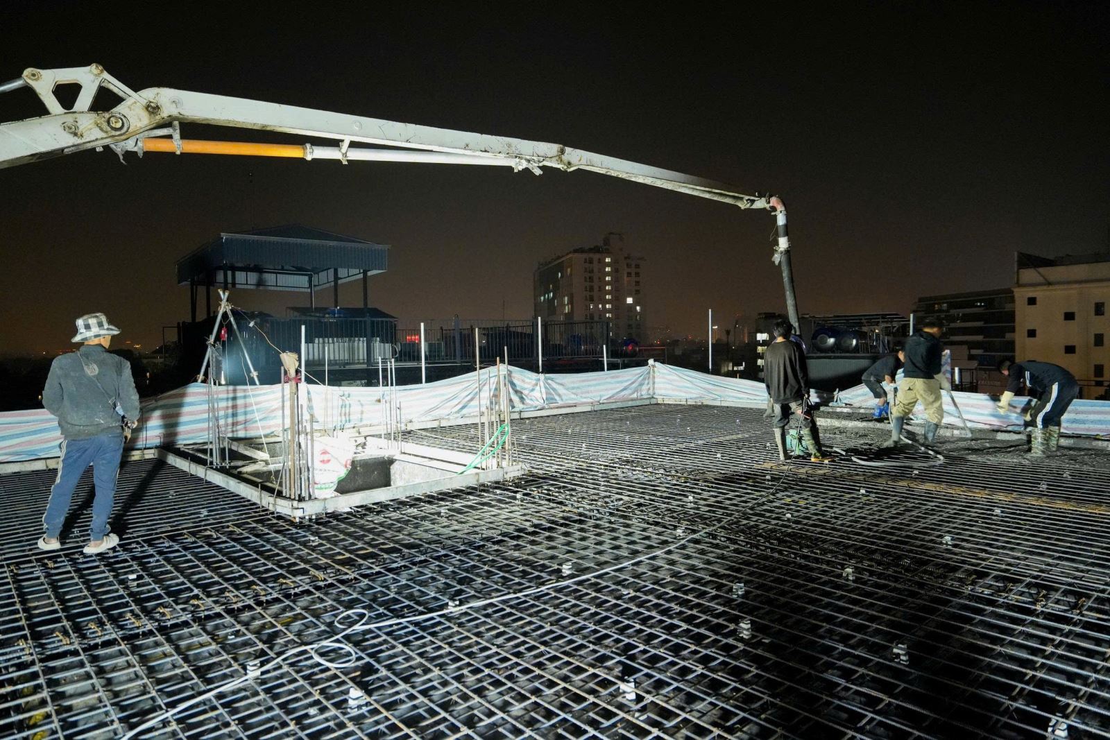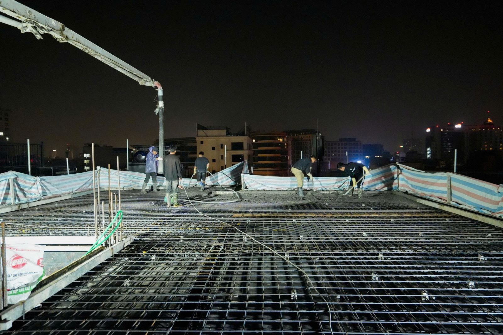Từng mẻ bê tông được đổ đều đặn, từng tiếng máy vang lên trong đêm tĩnh lặng — như một bản nhạc của sự tận tâm và kỷ luật. Suốt 4 tiếng đồng hồ liên tục, những người thợ, kỹ sư HTcons vẫn bền bỉ làm việc, để đảm bảo từng m2 sàn đạt chuẩn kỹ thuật.