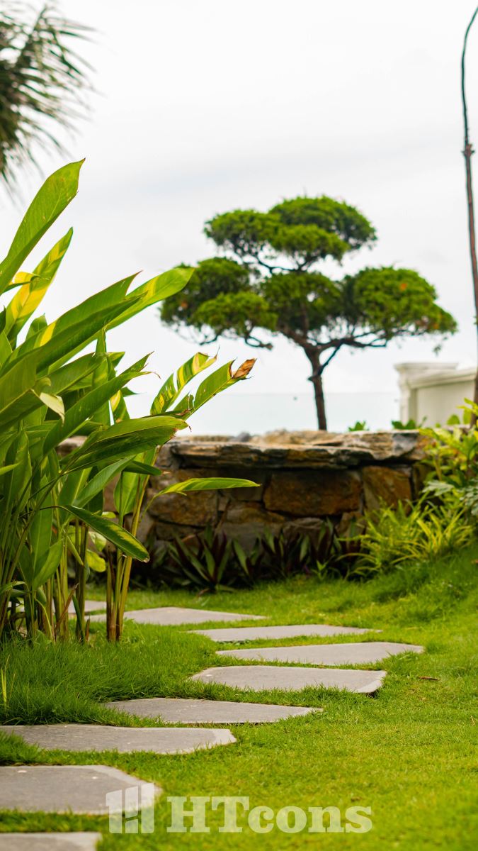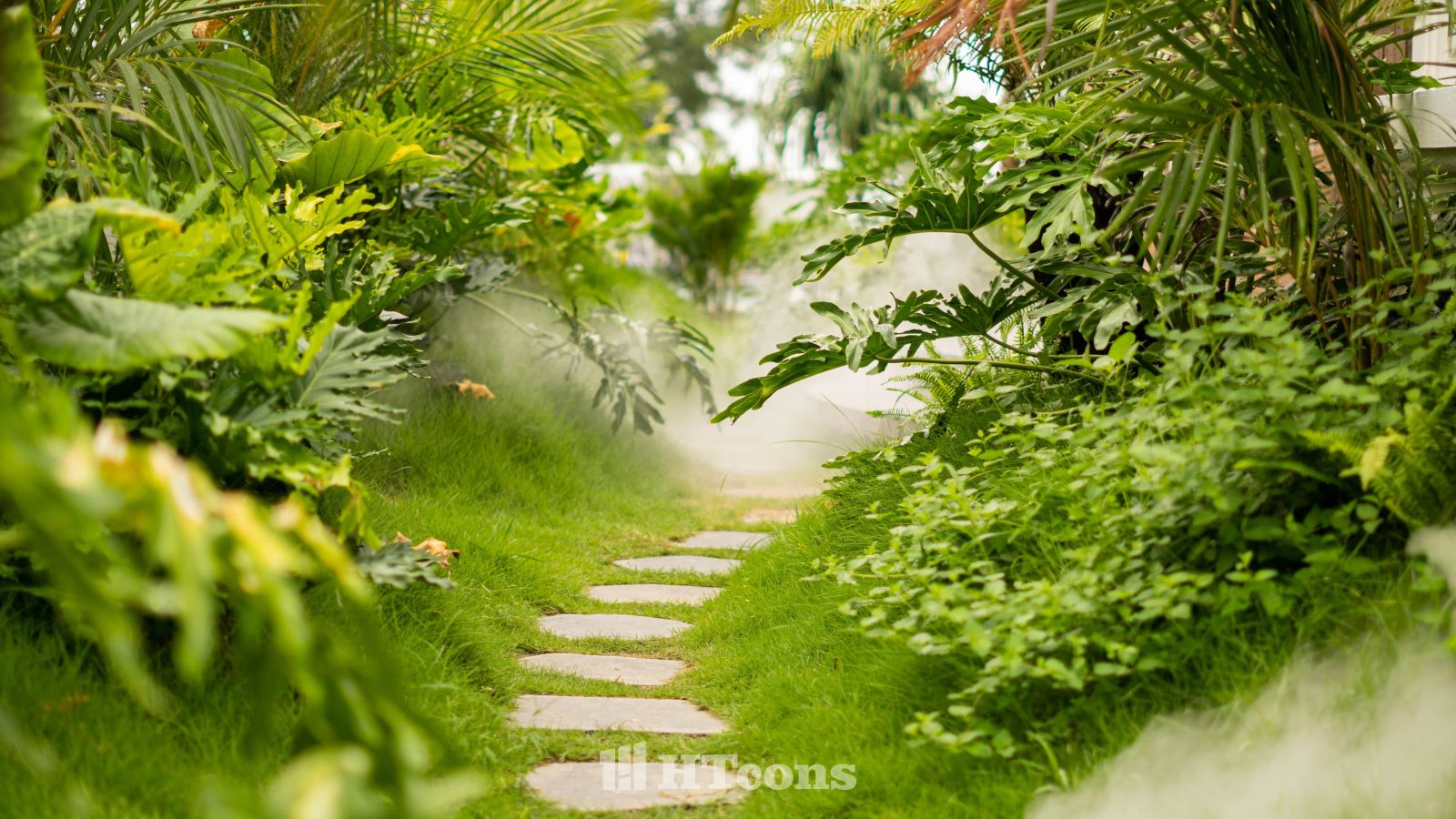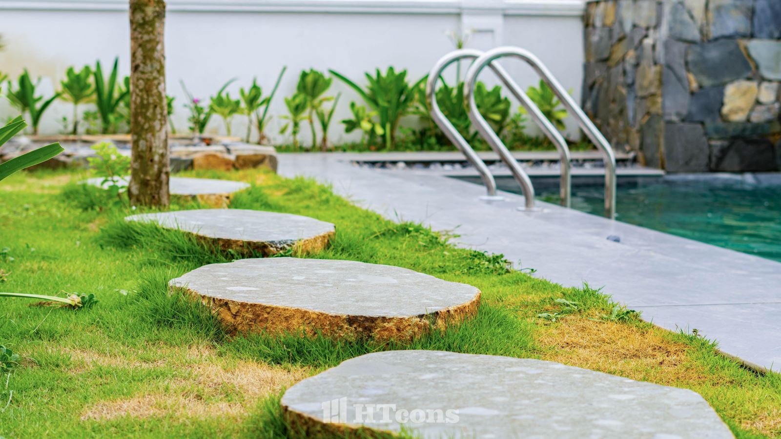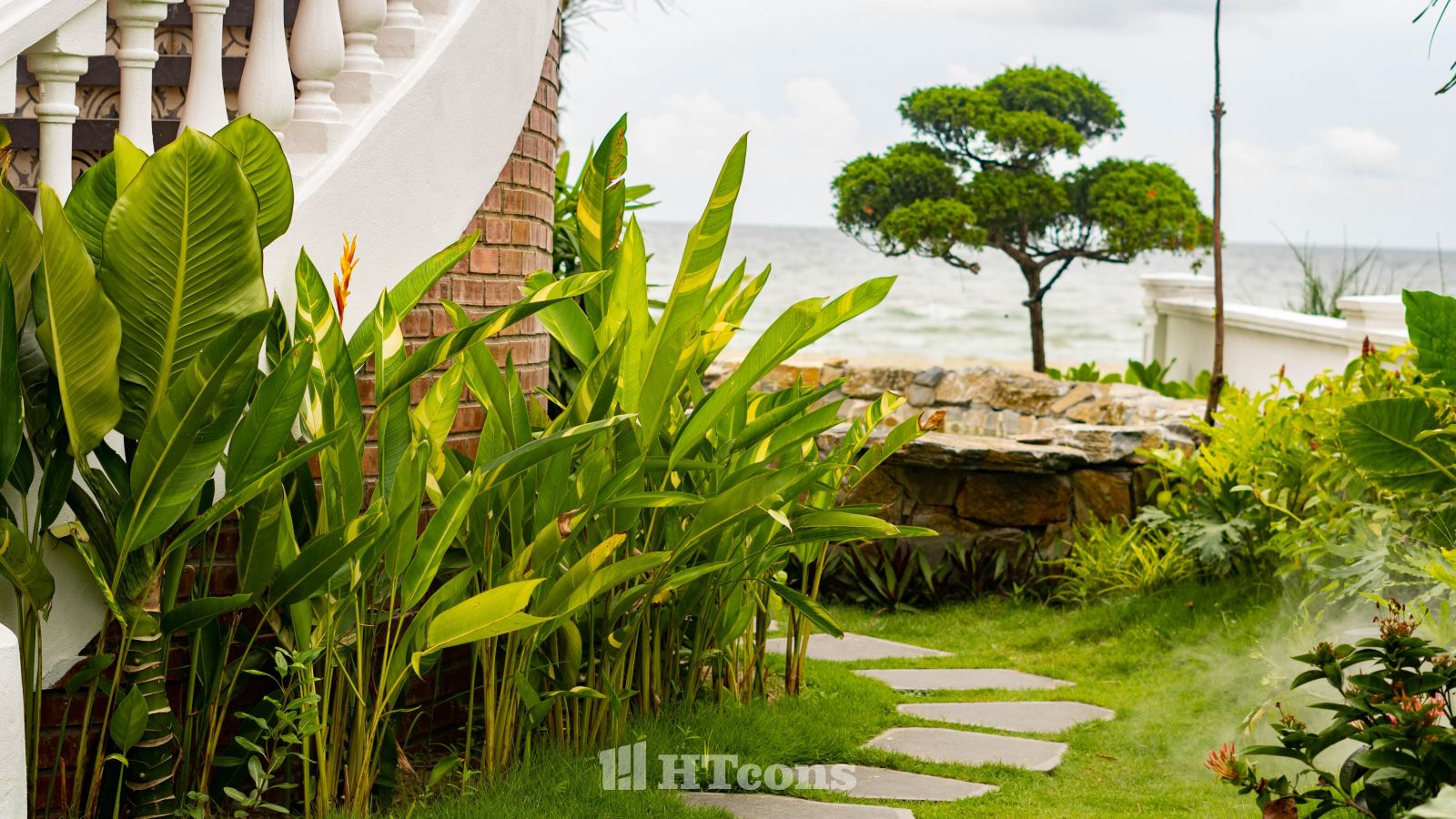 Tiếp theo, mời mọi người cùng chiêm ngưỡng khu vực sân vườn với phong cách nhiệt đới xanh mát!